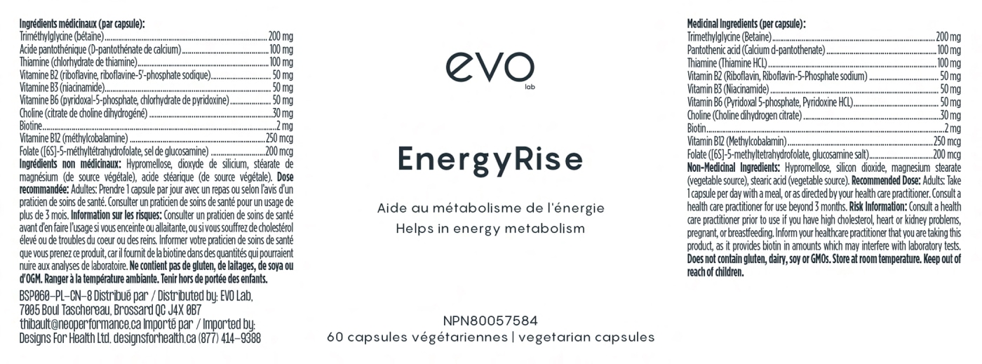 Energyrise est un supplément conçu pour soutenir l’énergie mentale et physique tout en améliorant la gestion du stress. Formulé avec un mélange de vitamines B, de triméthylglycine (Bétaïne), et de choline, ce supplément aide à maintenir un équilibre nerveux optimal, à réguler l’équilibre hormonal et à favoriser une meilleure humeur. Il contribue également à un métabolisme énergétique efficace, pour vous aider à rester concentré, productif et serein tout au long de la journée.
